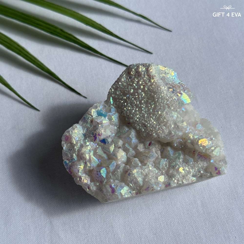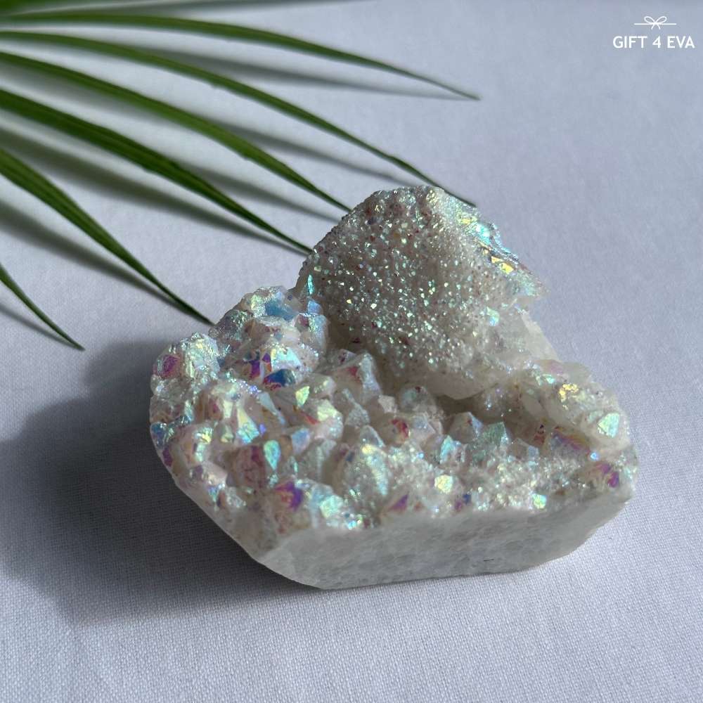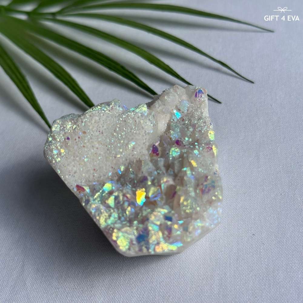 Aura clusters are formed through a vapor deposition method on quartz crystals, attaching a thin layer of metal to the surface. This produces a captivating and durable iridescent luster. Titanium, gold, cobalt, and platinum are the most frequently used metals for aura quartz. It's important to note that, although the core crystal is natural, the vibrant metallic shine is artificially created. Nonetheless, aura clusters remain highly sought-after for their distinct beauty and some believe they hold metaphysical powers. The specific properties associated with an aura cluster are dependent on the type of metal used - for example, aqua aura quartz is said to induce calmness and tranquility, while flame aura quartz is thought to inspire creativity and passion. Infused with unique properties and produced through a specialized process, aura clusters add a stunning and exquisite touch to any space, making them a beloved choice among crystal enthusiasts.