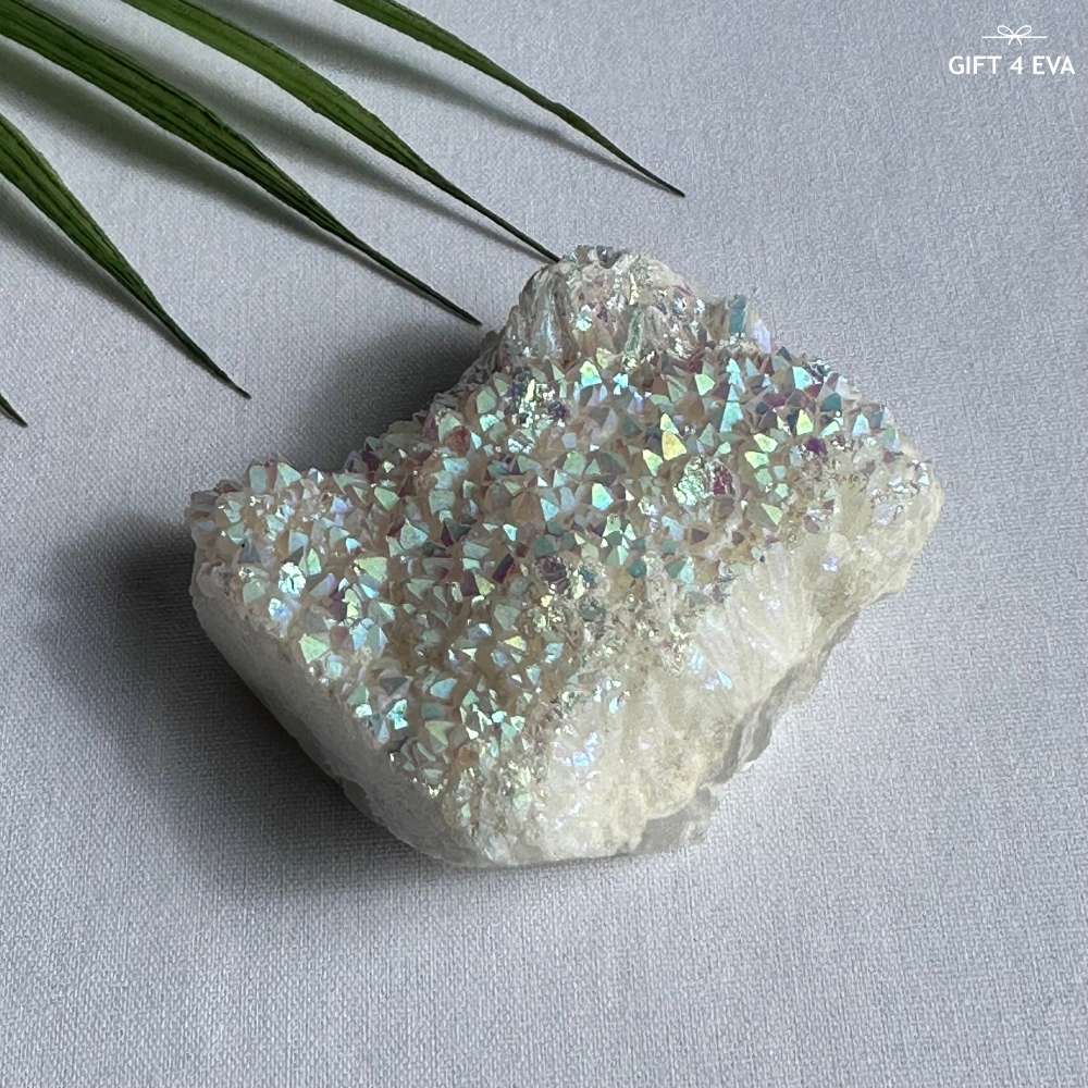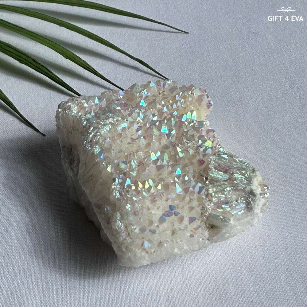 Aura clusters are made by treating quartz crystals with a vapor deposition process, bonding a thin layer of metal to the surface. This results in a gorgeous and lasting iridescent sheen. The metals most commonly used for aura quartz include titanium, gold, cobalt, and platinum. It's important to note that while the base crystal is natural, the vibrant metallic sheen is man-made. Despite this, aura clusters are highly sought after for their unique beauty and some believe they have metaphysical properties. The specific properties associated with an aura cluster depend on the type of metal used, such as aqua aura quartz promoting peace and tranquility, and flame aura quartz stimulating creativity and passion. With their specialized process and infusion of properties, aura clusters add a stunning and exquisite touch to any space, making them a popular choice among crystal enthusiasts.