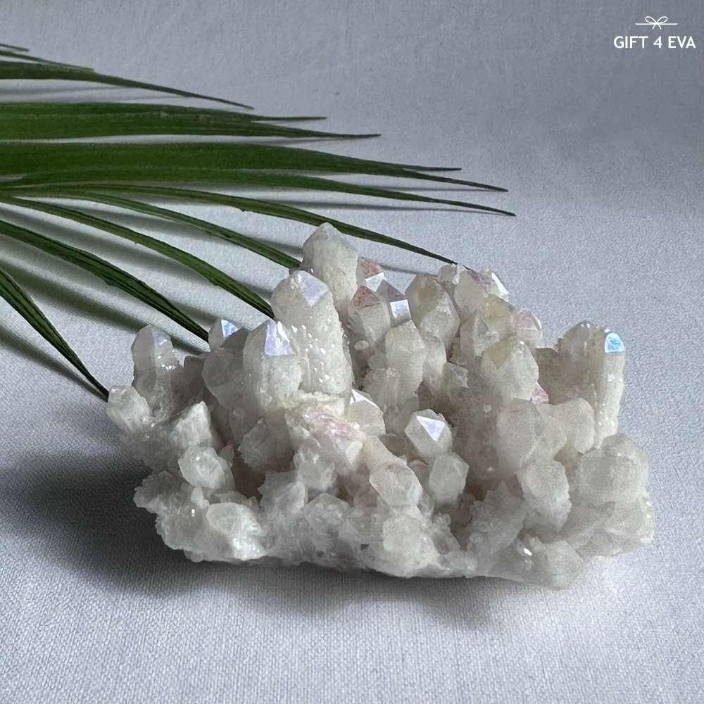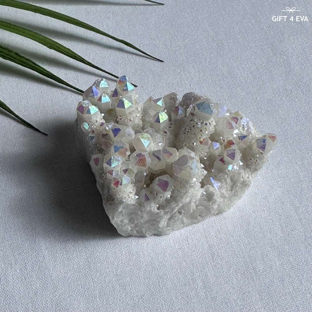 An aura cluster is a collection of quartz crystals that have been treated with a vapor deposition process to bond a thin layer of metal to the surface. This creates a permanent and beautiful iridescent sheen. The most common metals used for aura quartz are titanium, gold, cobalt, and platinum. It's important to note that aura quartz is not a natural crystal formation. While the base crystal is quartz, the colorful metallic sheen is human-made. Aura clusters are popular for their beauty and are believed by some to have metaphysical properties. The specific properties attributed to an aura cluster depend on the type of metal used to coat it. For example, aqua aura quartz is said to promote peace and tranquility, while flame aura quartz is said to stimulate creativity and passion. Aura clusters are popular for their unique and stunning beauty. The addition of metals through a specialized process creates a permanent iridescent sheen that adds an exquisite touch to any space. While these crystals are not naturally occurring, they are infused with properties based on the type of metal used, such as aqua aura quartz promoting peace and tranquility and flame aura quartz stimulating creativity and passion.
